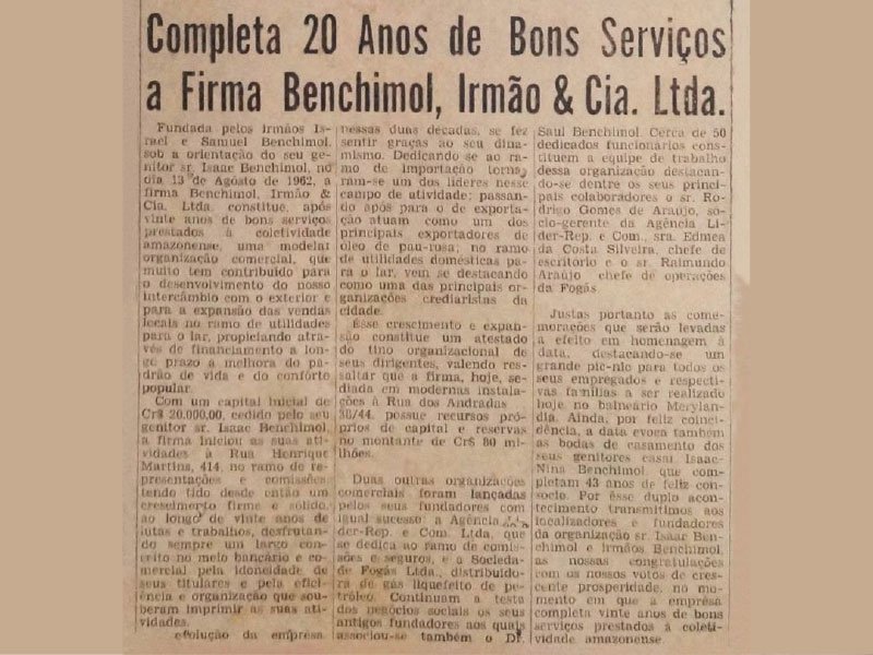 Criação da empresa Benchimol & Irmão, em 13 de agosto, em nome de Israel e Samuel, que se tornaria a matriz da Bemol. Propagandista e pracista do Laboratório Farmacêutico Sharp & Dohme.